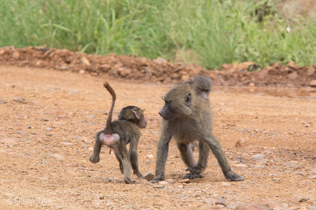 Oddly enough, I spent a lot of time photographing baboons on the way back to the lodge. Surrounded by 30 or so baboons, I watched them drinking from a puddle in the road, playing, and eventually fighting. Across the world, there are five species of baboons found throughout Africa and Arabia. They can survive in different habitats ranging from tropical rainforests to the savannas and they eat various crops (which is why they're known as pests).