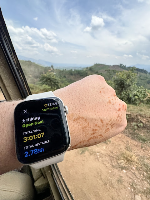 At 9:24 AM, we started trekking at an altitude of 5,220 feet. We went up, and up, and up. With no cloud cover, it was a hot hike until we turned into the forest. Due to a combination of the heat, altitude, and vertical incline, this was the hardest gorilla trek I've done out of my treks in Uganda and Rwanda. There were definitely times when I thought to myself, "I'm not going to make it" but I was determined to see the gorillas again, so I sucked it up, gritted my teeth, and put one foot in front of the other. When I thought I couldn't take it anymore, my porter Godfrey asked, "can you hear the gorillas?" I was thinking "No, not really... I'm over here catching my breath, Godfrey" but slowed my breathing down, listened, and heard the gorillas.